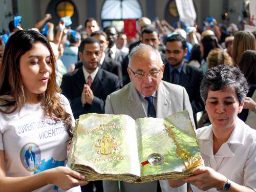 Católicos carregam relíquia com sangue do Papa João Paulo II durante missa no Santuário da Medalha Milagrosa, na Tijuca